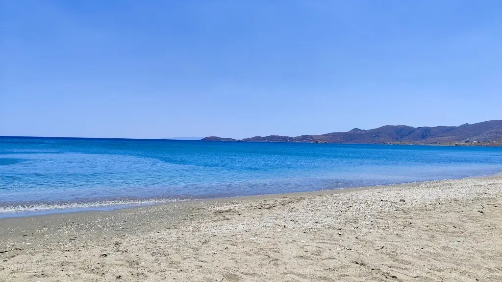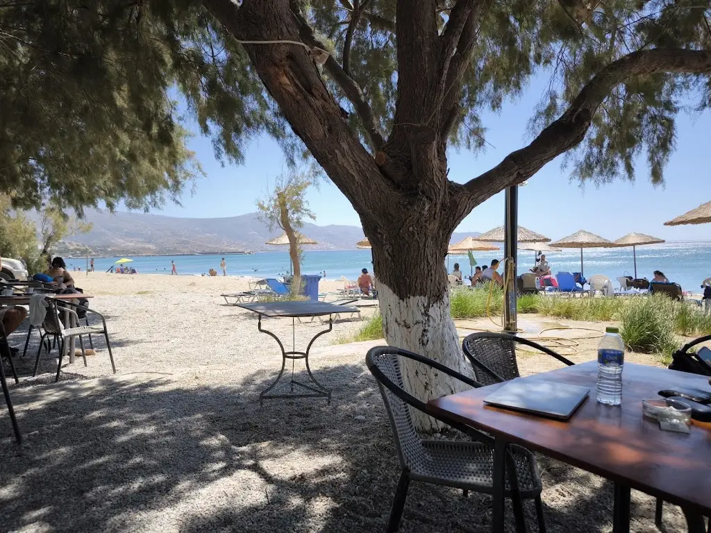 Taverne und Strand mit Sonnenliegen, Sonnenliegen sind kostenlos, wenn man etwas davon konsumiert. Ruhig, etwas natürlicher Schatten, viele Parkplätze, geschützt vor dem Nordwind, Sand und ein recht sanfter Einstieg ins Wasser.