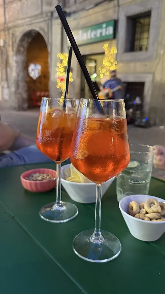 Lovely spot for an aperitivo. We had two spritz, and they brought a little sandwich nibble with salami, egg and mayo, as well as a nice serving of good quality chips. It’s located in a small square with little car traffic and a nice fountain.
