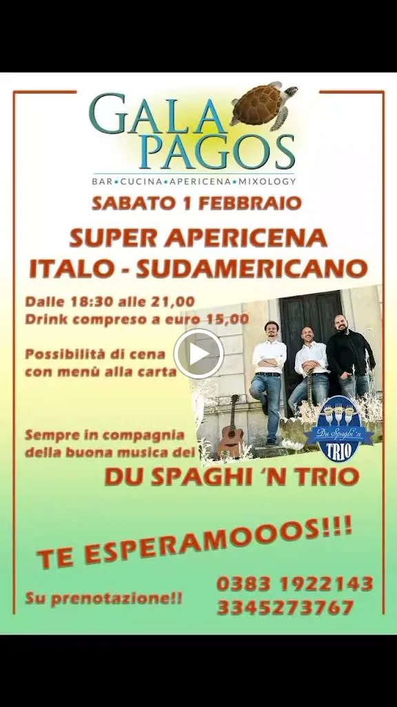 "GalapagosVoghera" is a pan-latin restaurant located in Voghera, offering a range of options including Has outdoor seating, Offers delivery, Offers takeaway, Serves dine-in. Known for Serves great cocktails, Serves great coffee, it features a menu with items such as Mojito Passion Fruit E Drink Pepit..., Encebollado De Pescado, Gin Tonic.