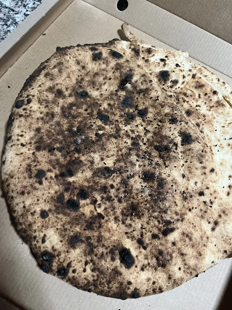 I ordered two pizza faccia di vecchia but as you can see from the photo the oregano is burnt and the oil is totally absent. I called to complain and they only told me that they make it like this. But for me it is inedible and I will never order again.