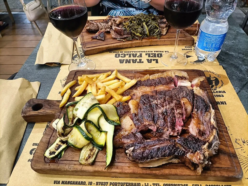 "La Tana del Falco" macelleria steakhouse paninoteca gastronomia is a steak house located in Portoferraio, offering a range of options including Has outdoor seating, On-site services available, Offers takeaway, Serves dine-in, No delivery, it features a menu with items such as Fiorentina, Grigliata Mista, Tagliata. a price range of $$.