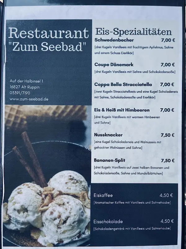 Restaurant & Partyservice "Zum Seebad" Alt Ruppin è un restaurant situato a Neuruppin, che offre una gamma di opzioni tra cui Ha posti a sedere all'aperto, Offers kerbside pickup, Ha consegna senza contatto, Offre consegna, Offre da asporto, Serve al tavolo. Conosciuto per Serve ottimo caffè, presenta un menu con piatti come Soljanka, Fried Fish, Heineken. una fascia di prezzo di $$.