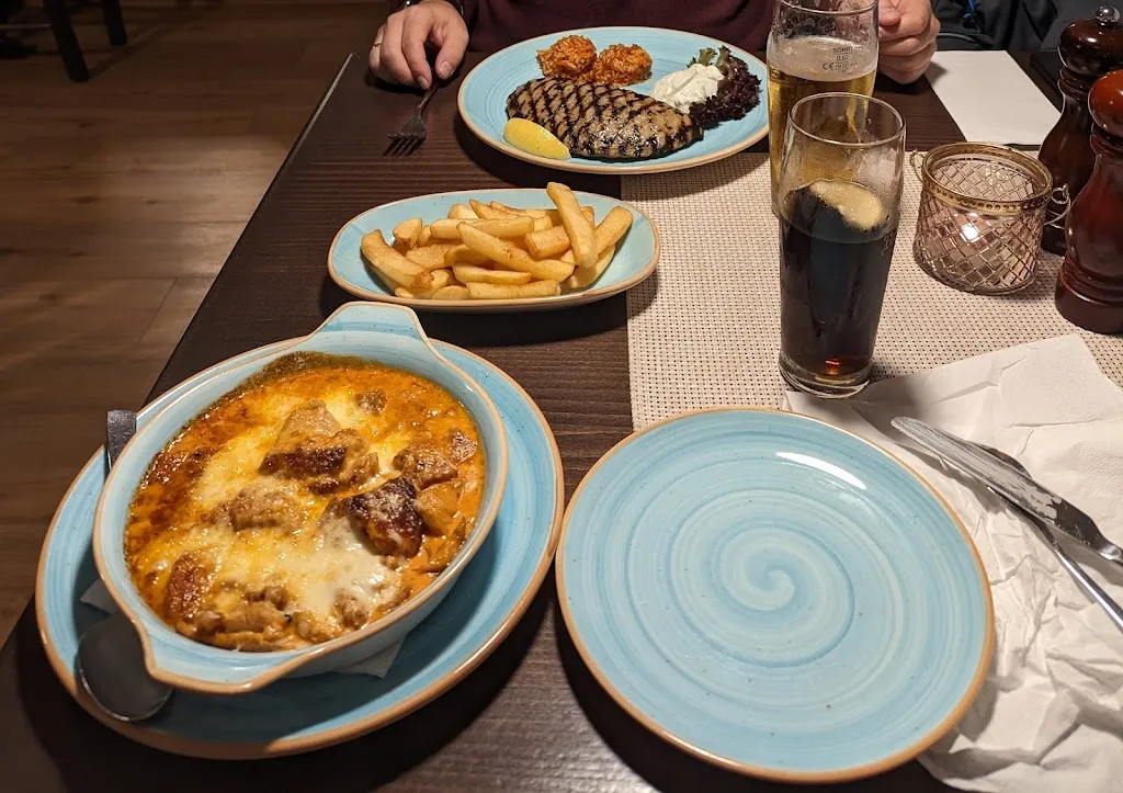 "Zum Griechen" Restaurant & Fremdenzimmer è un ristorante greco situato a Hausham, che offre una gamma di opzioni tra cui Ha posti a sedere all'aperto, Offers kerbside pickup, Offre da asporto, Serve al tavolo, Nessuna consegna. Conosciuto per Serve ottimo caffè, Ha un'ottima carta dei vini, presenta un menu con piatti come Gyros Calamari, Pulled Pork, Gyros Und Schweinefiletspiess. L'atmosfera è tipicamente descritta come Informale, Accogliente.